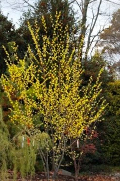 A lovely late-season surprise heralding the arrival of the holiday season, Harvest Moon is a native Witch Hazel that begins flowering around Thanksgiving and the harvest moon, a time when not much else, other than late-flowering Camellia sasanqua varieties, is blooming in the landscape. Providing fuller flowers and a much heavier display over a longer period from late fall through the winter months, the fragrant, ribbon-like fringe flowers are of a brilliant lemon-yellow color, standing out remarkably well on the bare stems and branches. The leaves emerge a reddish bronze in spring turning to green and then shades of golden yellow and bronze before dropping in mid fall to allow the flowers to take the stage. At 15 to 18 feet tall but only 10-12 feet wide when all grown up, its narrower habit is a better fit for smaller spaces than other varieties. You can allow it to grow naturally as a large shrub or lower branches can be removed to form a highly attractive small tree. Grows well in full sun or shade and everything between, but will be smaller in size with more shade. A beautiful large shrub or small tree that will always have you looking forward to the holiday season, the Harvest Moon Witch Hazel is a super hardy native providing a unique choice for screening and naturalized plantings or as an understory plant in woodland settings.